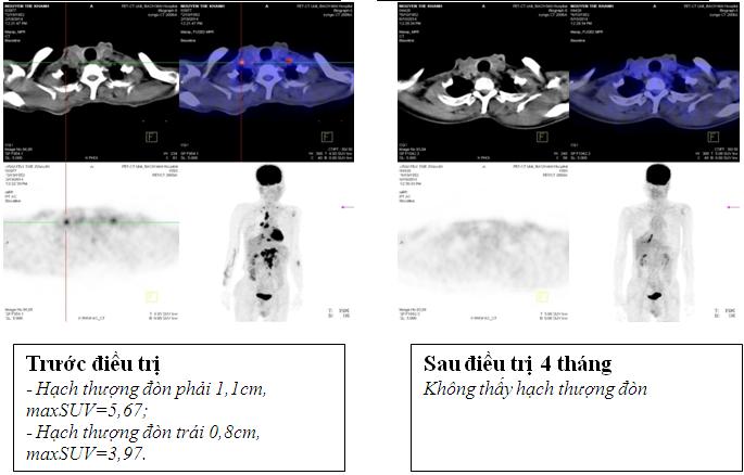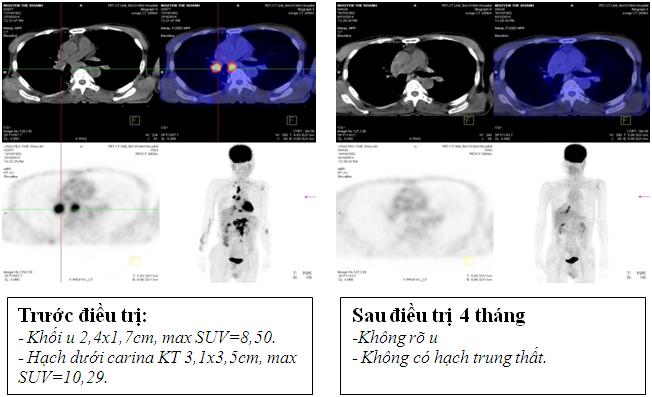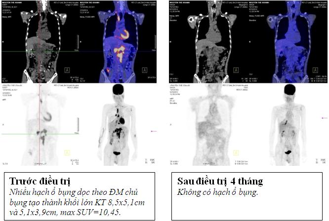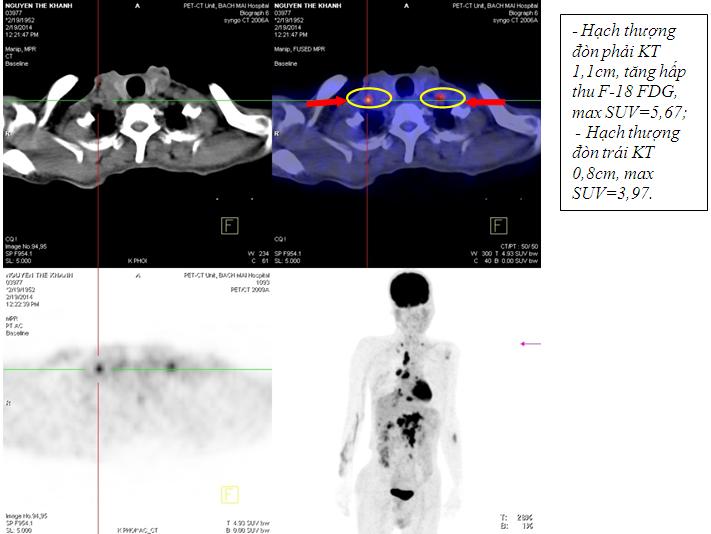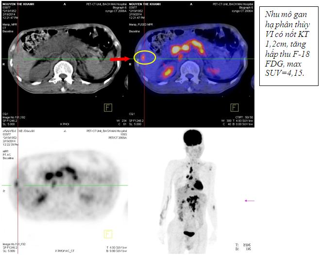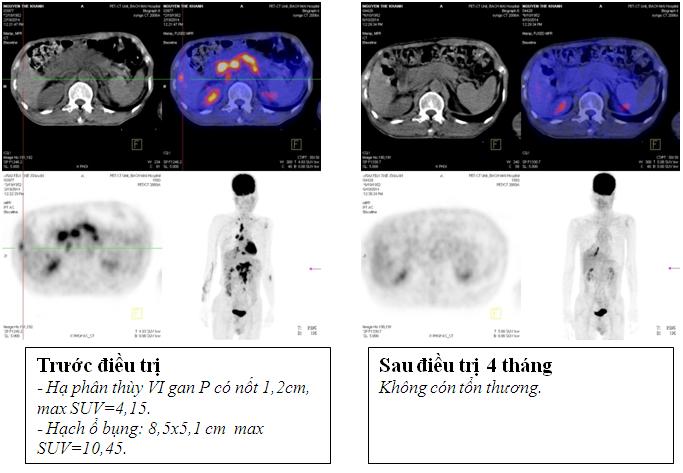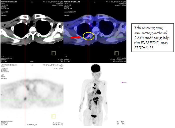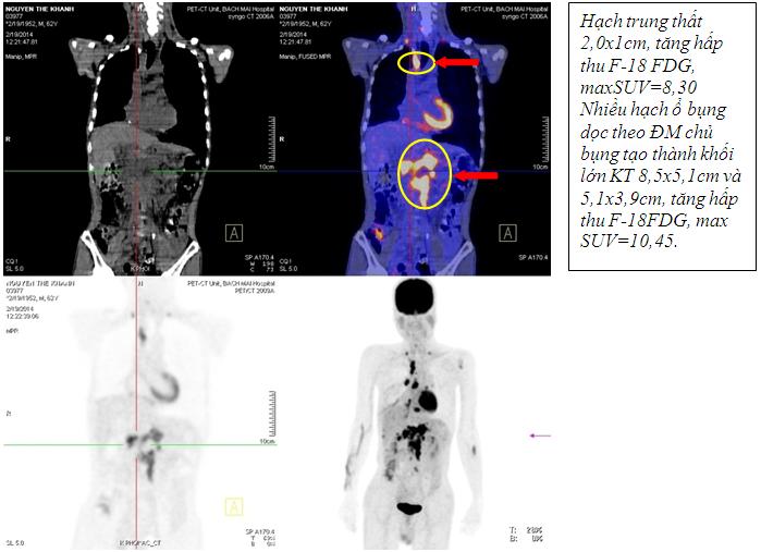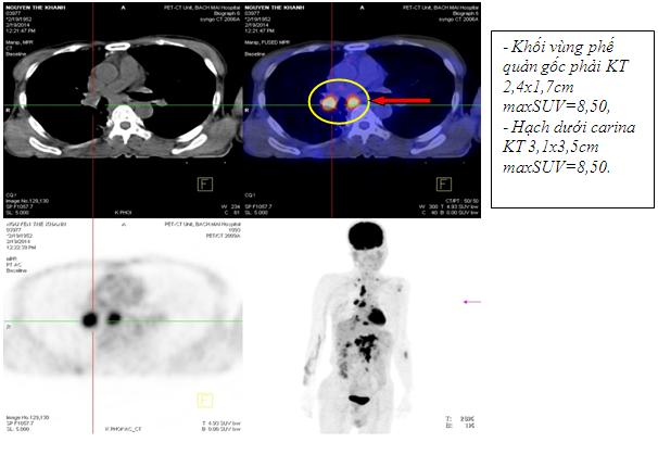 | Kết quả chụp PET/CT: Khối vùng phế quản gốc phải KT 2,4x1,7cm; maxSUV=8,50; Hạch dưới carina KT 3,1x3,5cm ; maxSUV=8,50;Nhiều hạch ổ bụng dọc theo ĐMchủ bụng tạo thành khối lớn KT 8,5x5,1cm và 5,1x3,9cm, tăng hấp thu F-18 FDG, maxSUV=10,45; Hạch thượng đòn phải KT 1,1cm, tăng hấp thu F-18 FDG, max SUV=5,67; Hạch thượng đòn trái KT 0,8cm, max SUV=3,97; Tổn thương cung sau xương sườn số 2 bên phải tăng hấp thu F-18 FDG, max SUV=3,13; Nhu mô gan hạ phân thùy VI có nốt KT 1,2cm, tăng hấp thu F-18 FDG, max SUV=4,15. | |