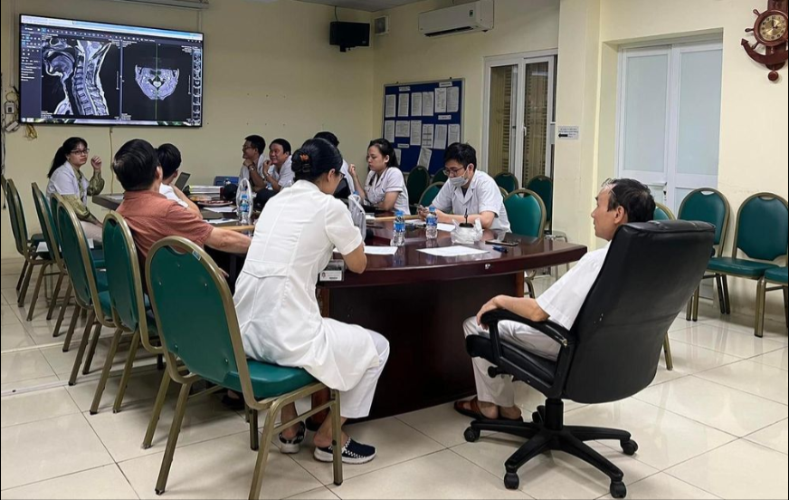GS Khoa vẫn miệt mài tham gia hội chẩn cùng bác sĩ trẻ. Ảnh: BVCC.