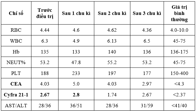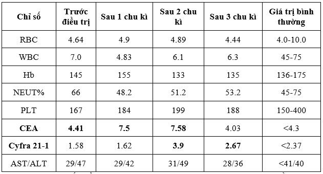 Nhận xét: Các chất chỉ điểm CEA, Cyfra 21-1 sau các chu kì điều trị duy trì trong giới hạn bình thường, bệnh nhân có tăng men gan nhẹ sau 5 chu kì điều trị.