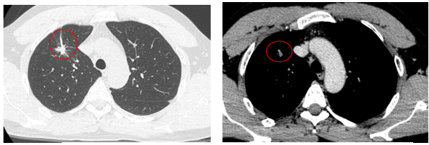 Cắt lớp vi tính ngực: Nhu mô thùy trên phổi phải có nốt đặc bờ không đều kích thước 6x4mm, xung quanh có các ổ giãn phế nang và các dải xơ co kéo nhẹ nhu mô phổi, hạn chế đánh giá tính chất ngấm thuốc do kích thước nhỏ. Ngoài ra nhu mô thùy trên có vài nốt đặc nhỏ <4mm, giới hạn rõ, bờ đều. Không thấy giãn phế quản - phế nang.