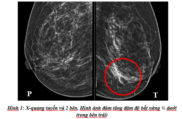 Cách vào viện 5 ngày, bệnh nhân xuất hiện chảy máu núm vú trái, máu đỏ tươi, số lượng ít, không đau vú, không tự sờ thấy khối u ở vú,không nôn, không sốt, không đau tức ngực. Bệnh nhân đi khám tại Bệnh viện Bạch Mai được chụp X-quang tuyến vú 2 bên cho hình ảnh tuyến vú trái có đám tăng đậm độ bất xứng góc 1/4 dưới trong - BIRADS 4, không thấy các vi vôi hóa nghi ngờ ác tính.