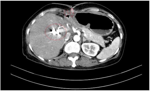 Hình 1. Hình ảnh sỏi đường mật tạo ổ áp xe gan - đường mật gan trái (vòng tròn màu đỏ). Giãn nhẹ đường mật trong gan hai bên. Dày thành nhẹ ngã ba đường mật trên phim chụp cắt lớp vi tính.