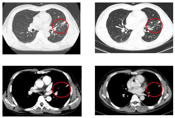 Hình 5: Hình ảnh chụp cắt lớp vi tính lồng ngực sau điều trị 3 và 6 tháng: vài dải xơ xẹp phổi trái, không phát hiện các tổn thương tái phát, thứ phát