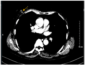 Hình 5: Hình ảnh cắt lớp vi tính lồng ngực: Hình ảnh vú phải có nốt ngấm thuốc vị trí 12 giờ -13 giờ, kích thước 10x12mm (mũi tên màu vàng).