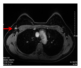 Hình 2. Hình ảnh chụp cộng hưởng từ tuyến vú. Hạch hố nách bên phải, có vỏ dày, kích thước 7x13mm (mũi tên màu đỏ)