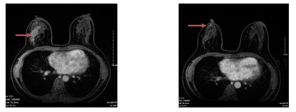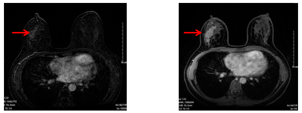 Hình 1. Hình ảnh chụp cộng hưởng từ tuyến vú: Hình ảnh khối u vú phải kích thước 25x61mm, sau tiêm ngấm thuốc sớm, tăng dần, không thấy thải thuốc (mũi tên màu đỏ)
