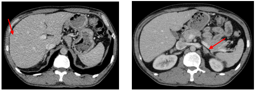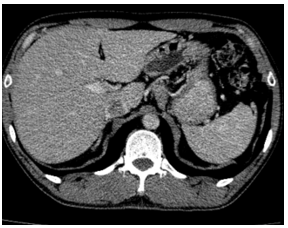 Hình 3. Trên phim chụp CT ổ bụng: Nhu mô gan sát bao gan phân thùy S5 có nốt giảm tỷ trọng trước tiêm, ngấm thuốc kém sau tiêm, đường kính 10mm – Theo dõi tổn thương thứ phát. Dày tuyến thượng thận trái.
