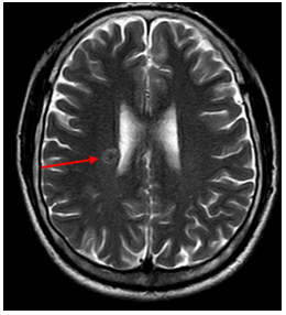 Hình 4. Trên phim chụp MRI sọ não: Rải rác trong nhu mô trên và dưới lều có các nốt ngấm thuốc, lớn nhất vị trí cạnh não thất bên bên phải đường kính ~11mm – Theo dõi tổn thương thứ phát