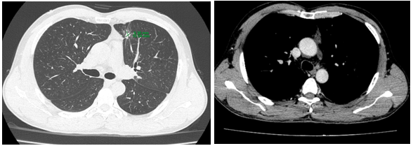 Hình 1. Trên phim chụp CT lồng ngực ở cửa sổ nhu mô: thùy trên phổi trái có khối đặc tròn bờ tua gai, kích thước: 29 x20mm, kính mờ và dày kẽ xung quanh, lân cận có nốt bán đặc kích thước 29 x 17mm, ngấm thuốc không đồng nhất sau tiêm, nghi ngờ có phần xâm lấn trung thất trước. Nhu mô thùy còn lại và nhu mô phổi phải lan tỏa các nốt đặc tròn to nhỏ không đều, đường kính: 2-8mm.
