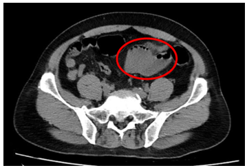 Hình 1: Hình ảnh chụp cắt lớp vi tính ổ bụng: Quai hồi tràng vùng hạ vị dày thành không đều, tạo khối kích thước 49x47mm (vòng tròn đỏ), thâm nhiễm mỡ xung quanh, ngấm thuốc mạnh đồng nhất sau tiêm.