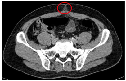 Hình 2: Hình ảnh chụp cắt lớp vi tính ổ bụng: Hình ảnh thâm nhiễm mỡ vùng hạ vị quanh vị trí vết mổ (vòng tròn đỏ).