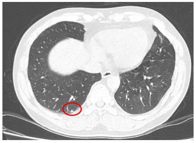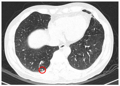 Hình 3: Hình ảnh chụp cắt lớp vi tính lồng ngực: Hình ảnh các nốt đặc rải rác 2 bên phổi, nốt lớn nhất kích thước 4mm (vòng tròn đỏ).