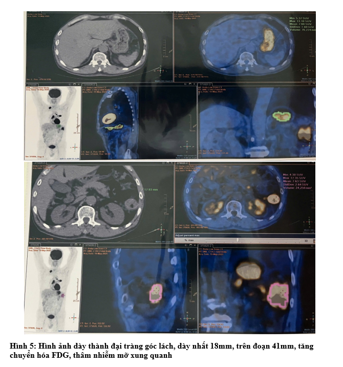 - Chụp PET/CT: Hình ảnh dày thành đại tràng góc lách, dày nhất 18mm, trên đoạn 41mm, tăng chuyển hóa, thâm nhiễm mỡ xung quanh. Vài hạch ở cạnh tổn thương đại tràng, cạnh động mạch chủ bụng và cạnh thân tụy tăng chuyển hóa, khả năng do di căn. Hình ảnh tổn thương bờ tua gai ở S3 phổi trái, kích thước 31x26x22mm, tăng chuyển hóa, khả năng là tổn thương ác tính nguyên phát. Hình ảnh vài hạch trung thất nhóm 5, 6, 7, hạch thượng đòn Phải tăng chuyển hóa, khả năng do di căn. Hình ảnh vài nốt bán đặc và kính mờ rải rác nhu mô phổi 2 bên, có nốt tăng chuyển hóa, khả năng do di căn