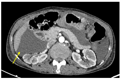 Hình 3: Dịch tự do ổ bụng, chỗ dày nhất 53 mm (mũi tên vàng).
