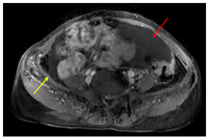 Hình 5: Vị trí cạnh đáy tử cung hai bên có các đám ngấm thuốc mạnh, lớn nhất kích thước 18x19mm, ranh giới không rõ với lớp cơ ngoài tử cung và các quai ruột lân cận (mũi tên đỏ). Trực tràng xẹp, hạn chế đánh giá,sơ bộ thấy dày nhẹ thành trước trực tràng cao, dày nhất 7mm, trên đoạn dài 50mm, tăng ngấm thuốc nhẹ sau tiêm, không thấy mất cấu trúc lớp, không thấy thâm nhiễm ngoài thành (mũi tên vàng).