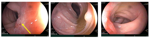 Hình 8: Trực tràng cách rìa hậu môn ~12cm có tổn thương thâm nhiễm co kéo niêm mạc xung quanh (mũi tên vàng), sinh thiết tổn thương làm mô bệnh học.
