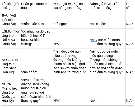 Bảng 2: Trích dẫn các hướng dẫn lâm sàng về giá trị của PET/CT với ligand PSMA đối với đánh giá bệnh nguyên phát, tồn tại dai dẳng sinh hóa (BCP), tái phát sinh hóa (BCR) và ung thư tiền liệt tuyến di căn