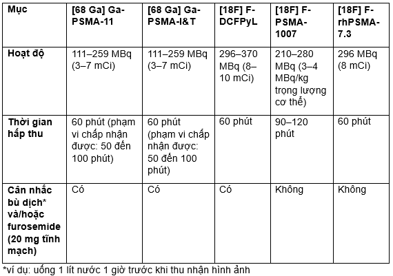 Quy trình sử dụng thuốc được tóm tắt trong Bảng 4. Các phối tử PSMA được tiêm tĩnh mạch nhanh. Hoạt độ tiêm và thời gian hấp thu đã được xác định trong thông tin kê đơn cho [68Ga]Ga-PSMA-11, [18F]F-DCFPyL, và [18F]F-PSMA-1007, và trong các đề cương thử nghiệm lâm sàng cho [18F]F-rhPSMA-7.3 (NCT04186819 và NCT04186845). Đối với các phối tử gắn nhãn 68 Ga, sự biến thiên về hoạt độ tiêm và thể tích có thể gây ra bởi thời gian bán rã ngắn của 68 Ga và hiệu suất chiết tách thay đổi đạt được trong suốt vòng đời của bình sinh hạt nhân phóng xạ 68Ge/68 Ga. Gallium được sản xuất từ cyclotron có thể giúp giảm bớt các vấn đề liên quan đến sản lượng thấp của bình sinh hạt nhân phóng xạ 68Ge/68 Ga [102].