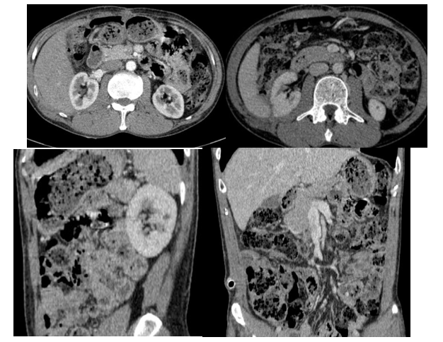 - Hình ảnh chụp cắt lớp vi tính ổ bụng (4/2025): Hình ảnh sau mổ u sau phúc mạc bên phải, hiện thấy tụ ít dịch mỏng, đám thâm nhiễm khoang sau phúc mạc. Ít dịch ổ bụng vùng hạ vị.