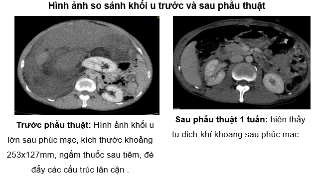 Trong quá trình phẫu thuật, bệnh nhân được kiểm tra ổ bụng thấy sạch, khối u mật độ chắc, giống tổ chức mỡ, u to chèn ép đè dẩy gan lên trên đại tràng ruột non xuống tiểu khung, đẩy thận phải và niệu quản lệch sang trái. Khối u ranh giới rõ với các tổ chức xung quanh, xâm lấn một phần cơ hoành và lớp mỡ sau phúc mạc. Bệnh nhân được phẫu thuật lấy toàn bộ khối u ra khỏi tổ chức xung quanh.