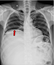 Hình 1. Hình ảnh chụp XQ ngực thẳng: vòm hoành phải bị đẩy lên cao do u chèn ép (mũi tên đỏ).