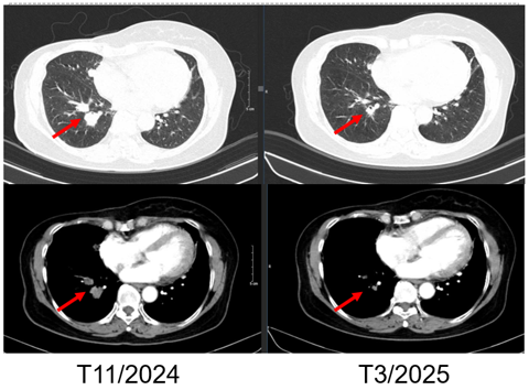 Tháng 11/2024: bệnh nhân tự sờ thấy nốt tổn thương cứng chắc vùng thành ngực phải với kích thước khoảng 1cm tại vị trí sẹo mổ cũ, được sinh thiết tổn thương thành ngực làm giải phẫu bệnh: Ung thư biểu mô xâm nhập, đánh giá phát hiện tổn thương di căn phổi. Sau đó bệnh nhân nhập viện vào Trung tâm Y học hạt nhân và Ung bướu, bệnh viện Bạch Mai để đánh giá và điều trị tiếp.