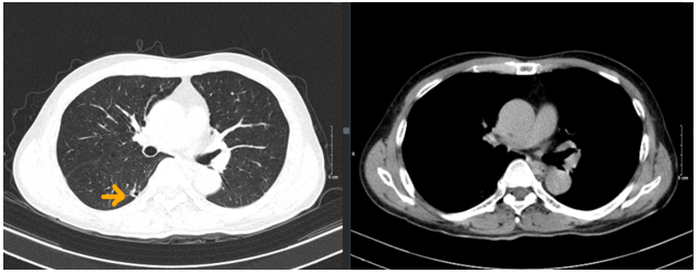 Hình 2. Hình ảnh chụp CLVT lồng ngực: nhu mô thùy trên phổi phải có nốt đặc đường kính khoảng 6mm (mũi tên vàng).