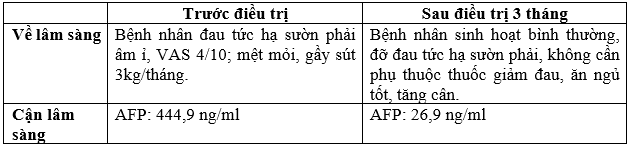 Đánh giá hiệu quả điều trị sau 3 tháng: Các triệu chứng lâm sàng được cải thiện rõ: Bệnh nhân ổn định, đỡ đau tức hạ sườn phải, ăn uống được, lao động và sinh hoạt bình thường, tăng cân (2kg/tháng).