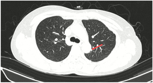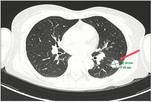 Hình 3: Các nốt đặc rải rác phổi trái, bờ đều, đường kính ~ 5mm - theo dõi tổn thương thứ phát.