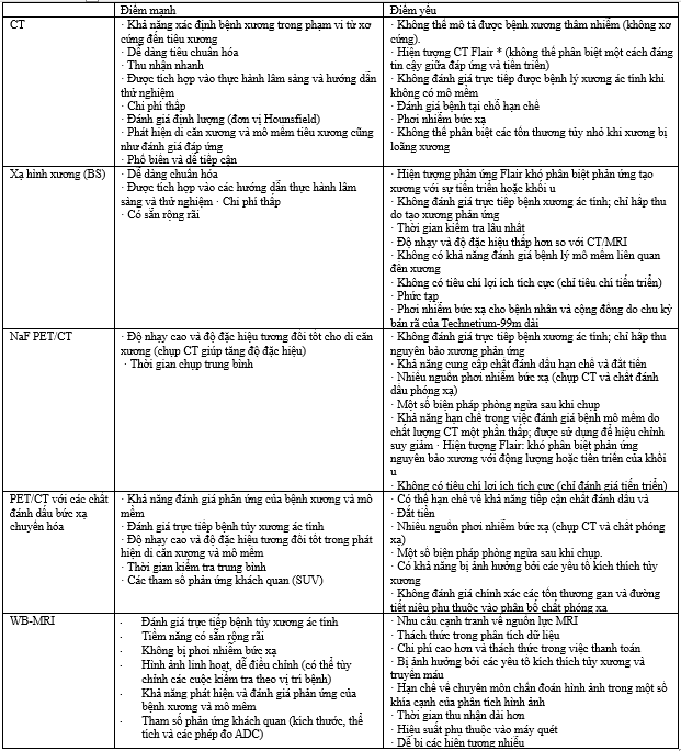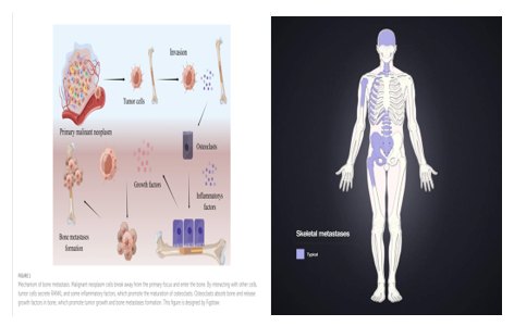 Hệ xương là một trong ba vị trí di căn thường gặp nhất trong những bệnh lý ung thư, trong đó rất thường gặp ở các vị trí xương trục điều này không chỉ gây các biến chứng đau xương,gãy xương bệnh lý, tăng calci máu mà còn gây chèn ép tủy sống, suy giảm chức năng vận động và làm giảm chất lượng sống.Việc chẩn đoán di căn xương cần kết hợp nhiều phương pháp trong đó các phương pháp như CT, WB-MRI, PET/CT đem lại nhiều giá trị không chỉ trong xác định giai đoạn, chẩn đoán di căn sớm ở bệnh nhân ung thư. Đau trong ung thư di căn xương dai dẳng, cường độ và mức độ đau nhiều là một thách thức trong điều trị và cải thiện chất lượng sống của bệnh nhân. Hiện nay, tình trạng đau xương do di căn đã được giải thích bằng nhiều cơ chế từ đó áp dụng và kết hợp được nhiều phương pháp điều trị khác nhau mở ra nhiều lựa chọn hơn cho các bác sỹ.