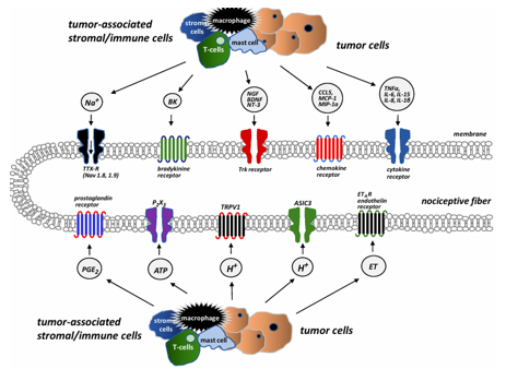Các tế bào khối u, tế bào mô đệm và tế bào viêm được tuyển dụng bởi các tế bào khối u (đại thực bào, bạch cầu trung tính, tế bào T, tế bào mast) sản xuất và giải phóng một số chất trung gian, và nguyên bào xương, tế bào hủy xương và sợi thần kinh cung cấp cho xương đóng vai trò là tác nhân. Các chất trung gian này bao gồm endothelin, bradykinin, protease, interleukin (IL) 6, ion hydro (H +), các yếu tố kích thích khuẩn lạc (CSF), yếu tố tăng trưởng thần kinh (NGF), prostaglandin (PG)E2, serotonin và yếu tố hoại tử khối u (TNF) α. Chúng có thể làm nhạy cảm hoặc kích hoạt các đầu dây thần kinh cảm giác trong xương. Thông tin về quá trình bệnh lý và tổn thương dẫn đến được truyền đến tủy sống và sau đó đến não, nơi nhận thức diễn ra. Xương trưởng thành nhận được sự bảo quản hạn chế và duy nhất. Tất cả các khoang xương (tủy, xương khoáng hóa và màng xương bên trên) được bao bọc bởi các sợi thần kinh cảm giác, khác nhau đáng kể về mật độ của chúng. Màng xương là nơi có mật độ dày đặc nhất, trong khi ít sợi thần kinh nhất nằm trong xương khoáng hóa. Cứ 100 sợi thần kinh trong màng xương, 2 dây thần kinh có thể được tìm thấy trong tủy xương và 0,1 trong xương khoáng hóa. Các dây thần kinh cảm giác chi phối xương chủ yếu là các sợi thần kinh có bao mielin mỏng và không có bao mielin: sợi thần kinh cảm giác A-(delta) hoặc C (80% dương tính với tropomyosin kinase A (TrkA)) [14]. Có nhiều loại thụ thể và kênh ion trên các dây thần kinh cảm giác cung cấp cho xương, và chúng giúp các thụ thể đau nhận biết và truyền tín hiệu từ các kích thích có hại do tế bào ung thư và các tế bào miễn dịch liên quan đến khối u tạo ra. Thụ thể endothelin (ETAR), thụ thể prostaglandin (PG), thụ thể TrkA, thụ thể bradykinin, thụ thể cytokine, thụ thể chemokine, TRPV1 (kênh tiềm năng thụ thể nhất thời, thành viên của họ vanilloid1), kênh ion cảm nhận acid 3 (ASIC3) và thụ thể purinergic (P2X3) được kích hoạt bởi các tế bào khối u, tế bào mô đệm và các chất trung gian tế bào miễn dịch được kích hoạt, bao gồm endothelin (ET), PGE2, NGF, bradykinin và cytokine tiền viêm(TNF, interleukin (IL1, IL6, IL8, IL15), chemokine (CCL5, protein thu hút bạch cầu đơn nhân-1 (MCP-1), protein viêm đại thực bào-1a (MIP-1a)), H+, và adenosine triphosphate ngoại bào (ATP).