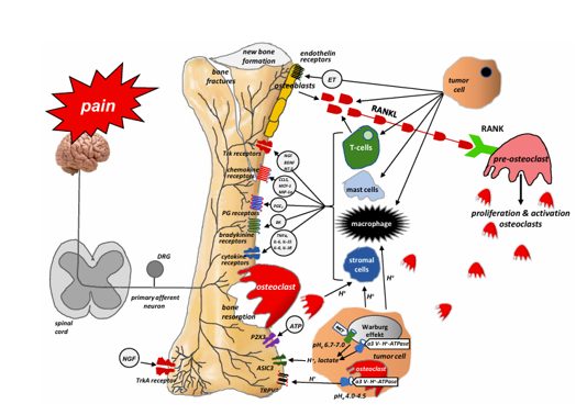 Quá trình di căn xương phụ thuộc rất nhiều vào sự giao tiếp giữa các tế bào khối u tấn công xương, tế bào ma trận xương và các sợi thần kinh nội xương. Tế bào khối u không làm tổn thương trực tiếp mô xương; thay vào đó, chúng chủ yếu kích hoạt hệ thống RANKL/ RANK (chất kích hoạt thụ thể cho yếu tố hạt nhân) bằng cách tạo ra chất kích hoạt thụ thể cho RANKL, sau khi liên kết với RANK trên bề mặt của tế bào hủy xương, bắt đầu tăng sinh của chúng và do đó, kích hoạt tác hại của chúng đối với xương [1]. RANKL là một thành viên protein của họ cytokine của các yếu tố hoại tử khối u được sản xuất bởi các tế bào khối u, dòng tế bào nguyên bào xương (tức là bởi các nguyên bào xương trưởng thành và tiền chất của chúng) và các tế bào T được kích hoạt. Biểu hiện RANKL phụ thuộc vào một loạt các yếu tố, bao gồm cytokine (IL1, IL6, IL11, TNFα) và glucocorticosteroid. Sự liên kết của RANKL với RANK có thể đóng một vai trò quan trọng trong sự tăng sinh, biệt hóa và trưởng thành của tế bào hủy xương, hấp thụ xương bằng cách tạo thành 'vịnh' hoặc 'hố' tái hấp thu có tính axit cao giữa tế bào hủy xương và xương. Nhiễm toan do tái hấp thu kích thích các kênh TRPV1 hoặc ASIC3 và gây đau xương do ung thư (CIBP)[36]. Việc phát hiện ra cơ chế này có ý nghĩa lâm sàng. Những năm gần đây đã chứng kiến sự ra đời của denosumab, một kháng thể globulin miễn dịch G2 đơn dòng ở người chống lại RANKL, vào thực hành lâm sàng. Do ái lực và độ đặc hiệu cao của nó, denosumab liên kết với RANKL và ngăn chặn sự kích hoạt của thụ thể RANK trên bề mặt của tế bào hủy xương và tiền chất của chúng, do đó ức chế sự hình thành, tăng sinh và tồn tại của chúng và giảm sự hấp thu xương nguyên bào xương. Nhiều nghiên cứu được thực hiện trong những năm gần đây đã hỗ trợ hiệu quả của denosumab trong việc giảm đau do di căn xương, giảm tỷ lệ gãy xương bệnh lý và cải thiện chất lượng cuộc sống (QoL) và hoạt động hàng ngày của bệnh nhân di căn xương.Nhiễm toan cục bộ đóng một vai trò quan trọng trong phá hủy xương do khối u gây ra và CIBP. Nó được kích hoạt chủ yếu bởi các tế bào hủy xương (làm tan các khoáng chất xây dựng xương và làm hỏng ma trận hữu cơ) và các tế bào khối u. Tế bào hủy xương hấp thụ xương thông qua các 'vịnh' có tính axit cao giữa tế bào hủy xương và xương. Những'vịnh' này giải phóng các proton, kích thích các kênh nhạy cảm với axit, chẳng hạn như TRPV1 và ASIC, được biểu hiện bởi các tế bào thần kinh cảm giác trong xương. Các tế bào khối u trải qua cơ chế Warburg, bảo vệ chúng khỏi nhiễm toan nội bào, giải phóng H+ và lactate ra bên ngoài tế bào. H + từ các nguồn được mô tả ở trên kích thích các tế bào thần kinh cảm giác trong xương bằng cách kích hoạt các kênh nhạy cảm với axit, chủ yếu là TRPV1 và ASIC3. Thông tin về sự kích hoạt của chúng sau đó được truyền đến các tầng trên của hệ thần kinh thông qua tủy sống đến não, nơi cảm nhận được cơn đau.