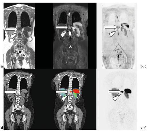 Hình 4. Hình ảnh cộng hưởng từ toàn thân đồng thời (WB-MRI) và chụp cắt lớp phát xạ positron/CT sử dụngoctreotide (PET/CT) ở một phụ nữ 73 tuổi với u thần kinh nội tiết phổi. (a–c) Hình ảnh T1 toàn thân, STIR, DWI cho thấy một ổ lớn (mũi tên) và một ổ nhỏ (đầu mũi tên) có cường độ tín hiệu thấp (SI) trên T1, cường độ tín hiệu trung gian trên STIR, và cản trở khuếch tán tại hai đốt sống ngực liền kề (T11 và T12).(d–f) Tương quan PET/CT với 68Ga-DOTATATE. Hình ảnh CT, PET/CT hợp nhất và PETcho thấy các tổn thương hoàn toàn tương ứng trong thân đốt sống T11 vàT12. Những tổn thương này là nguyên nhân gây xơ cứng xương mức độ nhẹ trên CT (hình d, mũi tên) và biểu hiện tăng bắt chất đánh dấu phóng xạ rõ rệt trên PET và PET/CT (hình e, f; mũi tên), qua đó chứng minh sự biểu hiện của thụ thể Somatostatin tại các ổ u.