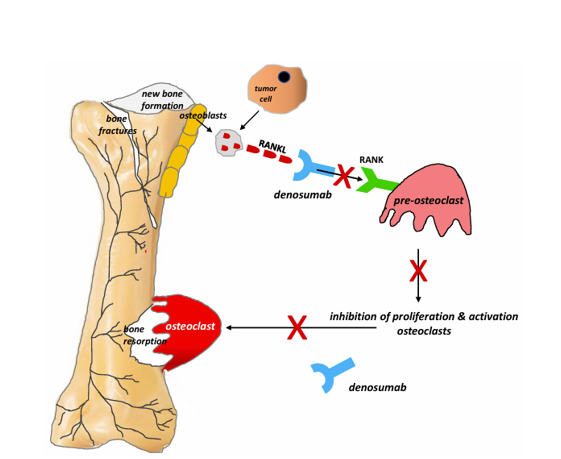 Denosumab là một kháng thể tổng hợp ở người, đơn dòng,liên kết với RANKL để ngăn chặn sự tương tác của nó với RANKL (Hình 3). Sự liênkết của RANKL với RANK là cần thiết cho sự tăng sinh và trưởng thành của tế bào hủy xương do sinh lý và khối u gây ra [1,36,57]. Điều trị bằng denosumab làm giảm chức năng tế bào hủy xương và do đó trì hoãn SRE và tái phát đau xương, cải thiện chức năng QoLand của bệnh nhân di căn xương [37,38]. Theo ESMO, denosumab được chỉ định thay thế cho bisphosphonate cho bệnh nhân di căn xương từ khối u rắn và u tủy.