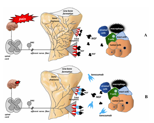 Sự xâm lấn của xương bởi các tế bào khối u bắt đầu sự phát triển bệnh lý và hình thành một mạng lưới các sợi thần kinh mới với hình thái, tổ chức và mật độ độc đáo, vượt quá mật độ của các sợi thần kinh trong xương bình thường lên đến 10–70 lần. Những sợi thần kinh bệnh lý mới này được hình thành trong màng xương, mô xương khoáng hóa và tủy xương do hoạt động của các chất trung gian được sản xuất và giải phóng bởi các tế bào khối u. Người ta đã chỉ ra rằng NGF đóng một vai trò quan trọng trong việc tạo ra các mạng lưới bệnh lý như vậy. NGF thuộc họ neurotrophin. Nó được tổng hợp trong các mô xung quanh dây thần kinh và đảm bảo sự phát triển thần kinh thích hợp. Trong sức khỏe, các tế bào tổng hợp NGF bao gồm bạch cầu ái toan, tế bào mast, đại thực bào, tế bào sừng và tế bào Schwann. Trong điều kiện bệnh lý, NGF được sản xuất bởi các tế bào khối u, viêm và hệ thống miễn dịch. NGF ảnh hưởng đến các tế bào đích của nó bằng cách liên kết với hai loại thụ thể màng: TrkA (đặc hiệu cho NGF) và p75NTR (một thụ thể phổ biến cho tất cả các chất dinh dưỡng thần kinh). Khi liên kết với TrkAreceptor, NGF điều chỉnh sự giải phóng các chất dẫn truyền thần kinh (ví dụ: chất P, peptide liên quan đến gen calcitonin(CGRP)), kích hoạt các kênh ion (TRPV1, ASIC–3, P2X3, kênh natri) và thụ thể(ví dụ: đối với bradykinin), và điều chỉnh sự tổng hợp các hạt cấu trúc (ví dụ: sợi thần kinh). NGF cũng chịu trách nhiệm cho sự nảy mầm bệnh lý và tổ chức lại các sợi thần kinh cảm giác và giao cảm, cũng như sự hình thành các cấu trúc giống như u thần kinh bên trong chúng. Cơ chế thứ hai rất có thể là nguyên nhân gây ra cơn đau kịch phát và đợt cấp của nó khi vận động hoặc hoạt động ở bệnh nhân di căn xương. Sự nảy mầm này dường như cần NGF vì việc sử dụng thuốc kháng NGF hoặc chất ức chế pan-Trk kéo dài phần lớn ngăn chặn sự nảy mầm bệnh lý của các sợi thần kinh cảm giác và sự hình thành các cấu trúc giống như u thần kinh và ức chế đáng kể sự đau đớn.Trong xương bình thường, các sợi thần kinh cảm giác và giao cảm tách biệt với nhau. Sự phát triển bệnh lý do khối u gây ra của các sợi thần kinh cảm giác và giao cảm được quan sát thấy trong di căn xương dẫn đến việc tổ chức lại chúng và hình thành các kết nối giữa các loại sợi thần kinh này; Kết quả là, các kích thích đau cũng có thể được gây ra bởi sự kích hoạt của các sợi giao cảm [39]. Việc phát hiện ra các cơ chế này đã cho phép các nhà nghiên cứu tìm kiếm các phương pháp điều trị đau xương mới ở bệnh nhân ung thư. Tanezumab là một kháng thể kháng NGF đơn dòng được nhân hóa ngăn NGF kích hoạt các thụ thể TrkA. Do đó, nó ức chế sự nảy mầm bệnh lý Việc phát hiện ra những cơ chế này đã cho phép các nhà nghiên cứu tìm kiếm các phương pháp điều trị đau xương mới ở bệnh nhân ung thư. Tanezumab là một kháng thể kháng NGF đơn dòng được nhân hóa ngăn chặn NGF kích hoạt các thụ thể TrkA. Do đó, nó ức chế sự nảy mầm bệnh lý và hình thành các mạng lưới sợi thần kinh bệnh lý mới và do đó có thể làm giảm đau bệnh nhân nội trú bị đau xương di căn.
