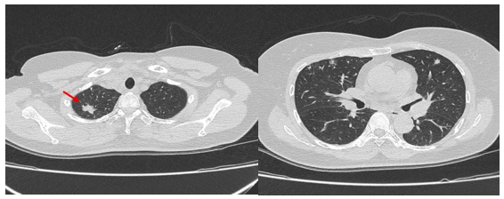 - Cắt lớp vi tính lồng ngực: Đám xẹp vùng đỉnh phổi phải, nốt đặc nhỏ kích thước 2-3mm. Không thấy hạch to hay khối trong trung thất