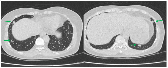 Hình 2: Hình ảnh cắt lớp vi tính ngực có tiêm: Rải rác nốt đặc 2 bên thùy phổi kích thước 3-10mm (các mũi tên màu xanh lá)