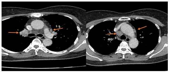 Hình 3: Hình ảnh cắt lớp vi tính ngực có tiêm: Trung thất các nhóm 1R; 2R; 4R; 5; 8; 10RL có vài hạch lớn nhất kích thước 26x15mm; bờ không đều; ngấm thuốc không đồng nhất sau tiêm (mũi tên màu cam)