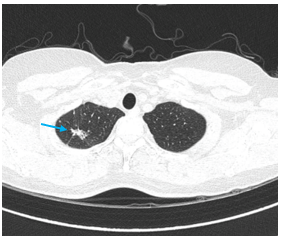 Hình 6: Hình ảnh cắt lớp vi tính ngực có tiêm: đám xẹp đông đặc đỉnh phổi phải kích thước 11mm (mũi tên xanh nước biển)