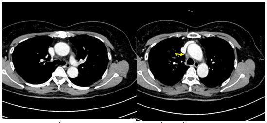 Hình 7: Hình ảnh cắt lớp vi tính ngực có tiêm: Trung thất cân đối có vài hạch 10mm (mũi tên vàng). Hạch trung thất giảm kích thước rất nhiều chỉ sau 03 chu kỳ.