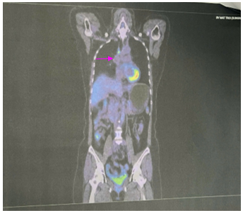 Hình 8: Hình ảnh PET CT:  Hạch cạnh khí quản đoạn thấp kích thước 7x9mm, tăng chuyển hóa FDG (SUV max: 4.83). (mũi tên màu hồng)
