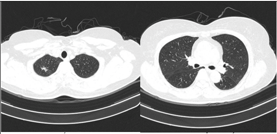 Hình 10: Hình ảnh cắt lớp vi tính ngực có tiêm: Đám xẹp vùng đỉnh phổi phải, nốt đặc nhỏ kích thước 2-3mm