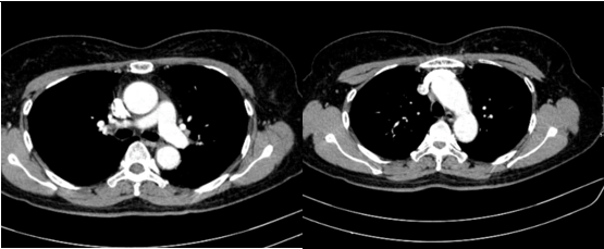 Hình 11: Hình ảnh cắt lớp vi tính ngực có tiêm: Không thấy hạch to hay khối trong trung thất