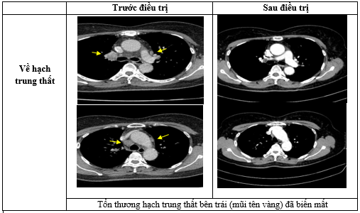 Nhận xét: Chỉ sau 03 chu kỳ Pemetrexed – Carboplatin – Pembrolizumab, hình ảnh chụp cắt lớp vi tính cho thấy tổn thương phổi nguyên phát và các hạch giảm kích thước đáng kể. Đáp ứng điều trị được đánh giá là đáp ứng một phần theo tiêu chuẩn RECIST 1.1. Sau 9 chu Pemetrexed – Pembrolizumab, bệnh nhân tiếp tục ghi nhận cải thiện rõ rệt các triệu chứng lâm sàng, thể trạng ổn định, không xuất hiện tác dụng không mong muốn nghiêm trọng.Đánh giá trên hình ảnh chụp cắt lớp vi tính cho thấy tổn thương phổi nguyên phát tiếp tục giảm kích thước không ngấm thuốc chỉ còn là đám xơ xẹp vùng đỉnh phổi phải, các hạch trung thất và ngoại vi thu nhỏ rõ rệt, không phát hiện được trên phim chụp và không ghi nhận tổn thương di căn mới.