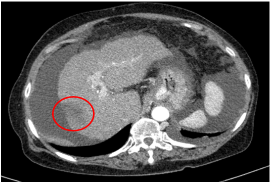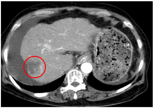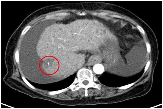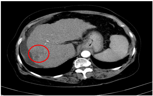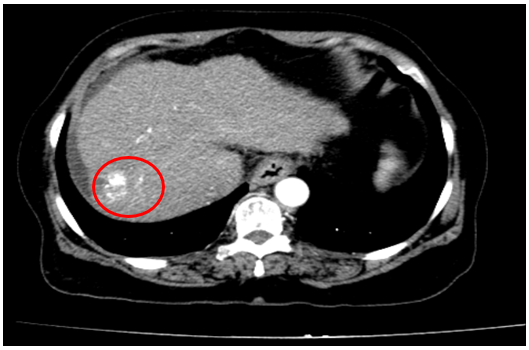 =>Hình ảnh u gan phải sau điều trị hiện không thấy phần ngấm thuốc sau tiêm (Bệnh đáp ứng điều trị nên không có tổ chức ngấm thuốc) (Vòng tròn đỏ)