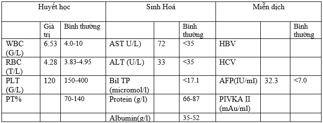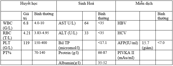 Chụp cắt lớp vi tính ổ bụngGan: biến đổi hình thái, bờ gan mấp mô không đều. Nhu mô gan có nhiều nốt giảm tỷ trọng trước tiêm, sau tiêm ngấm thuốc kém đường kính dưới 10mm dạng nốt xơ. Hạ phân thùy VII gan phải sát bao gan có nốt kích thước 22x31mm giảm tỷ trọng trước tiêm, sau tiêm không ngấm thuốc