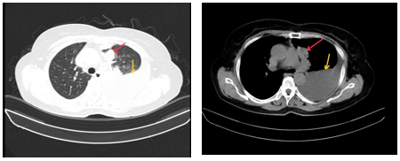 Hình 1: Hình ảnh cắt lớp vi tính ngực lúc mới nhập viện: Khối tổn thương thùy trên phổi trái, tỷ trọng tổ chức, bờ không đều, ngấm thuốc không đồng nhất, xâm lấn màng phổi trung thất (mũi tên màu đỏ). Tràn dịch màng phổi trái lượng nhiều gây xẹp phổi thụ động thùy dưới (mũi tên màu vàng).
