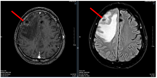Hình 1. Hình ảnh cộng hưởng từ sọ não ngày 25 tháng 03 năm 2025 (hình bên trái: xung T1; hình bên phải: xung T2) cho thấy khối u não vùng trán phải (mũi tên).