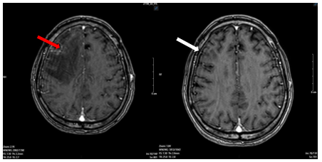 Hình 6. Hình ảnh phim chụp cộng hưởng từ não ngày 12 tháng 07 năm 2025 (mũi tên trắng) so với ngày 25 tháng 03 năm 2025(mũi tên đỏ) cũng thể hiện kích thước khối u đã giảm đáng kể so với phim chụp cũ.