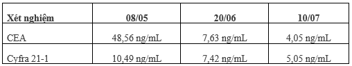 Sau đó, bệnh nhân tiếp tục duy trì điều trị miễn dịch kết hợp hóa trị, sau gần 5 tháng điều trị, bệnh nhân vẫn đáp ứng rất tốt, không đau đầu, chóng mặt, gần như không còn yếu nửa người trái. Bệnh nhân có thể tự sinh hoạt tốt. Trên các kết quả xét nghiệm, chỉ điểm khối u CEA và Cyfra 21-1 cũng cho các kết quả tốt.